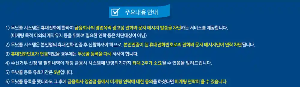 두낫콜에서 신청 후 각 금융회사 전산에 반영까지 최대 2주가 소요될 수 있습니다. 2주 경과 후에도 반영이 없으면 ‘이용안내 > 이용 및 문의 안내’에 기재된 해당 금융회사 문의처로 연락하세요. 등록과 철회를 반복하면 최종 신청내역 기준으로 산정될 수 있습니다.