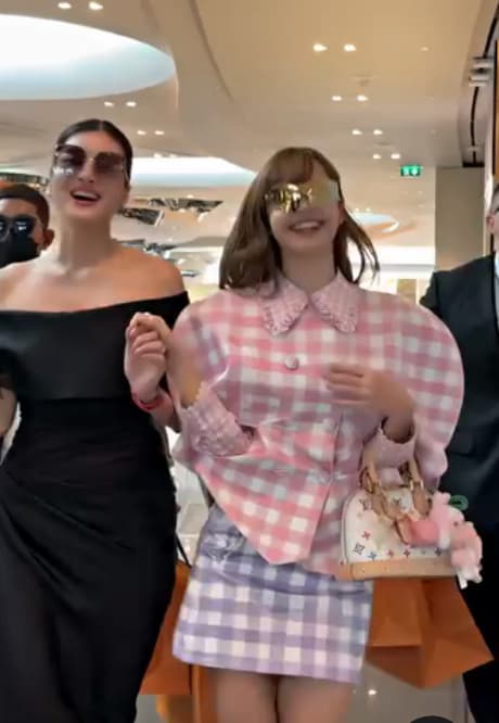 쇼핑몰에서 선글라스를 착용한 블랙핑크 리사가 핑크 체크 코트와 미니 스커트 차림으로 라부부 키링이 달린 명품 가방을 들고 환하게 웃으며 걷고 있는 장면
